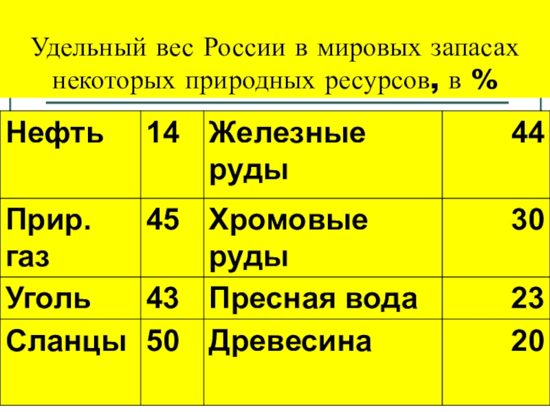Удельный вес России в мировых запасах некоторых природных ресурсов, в %