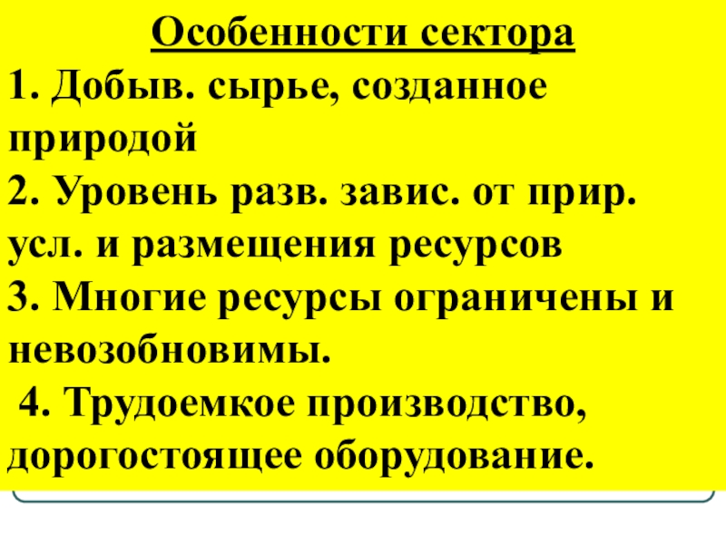 Особенности сектора1. Добыв. сырье, созданное природой 2. Уровень разв. завис. от прир. усл. и размещения ресурсов 3.