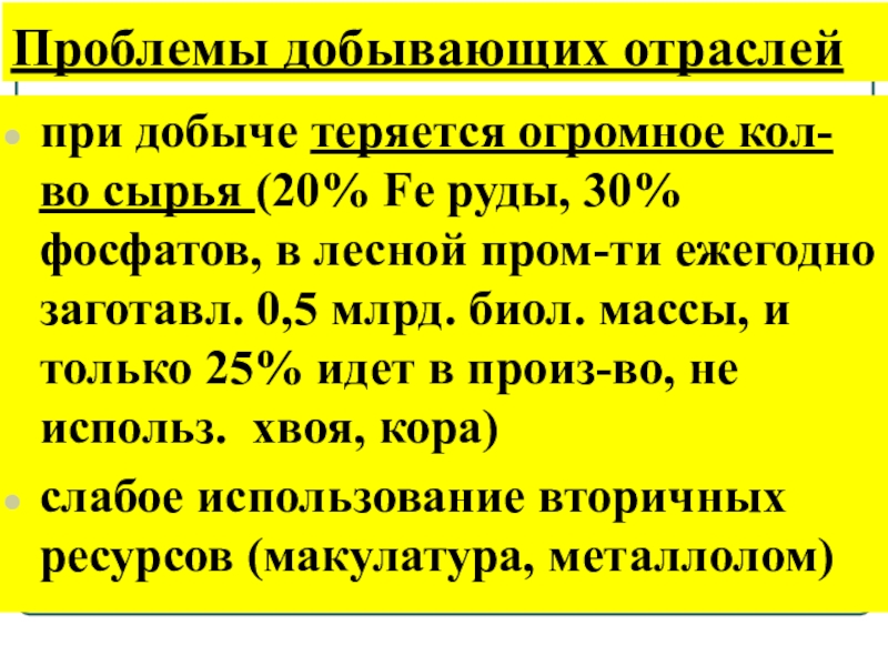 Проблемы добывающих отраслейпри добыче теряется огромное кол-во сырья (20% Fe руды, 30% фосфатов, в лесной пром-ти ежегодно