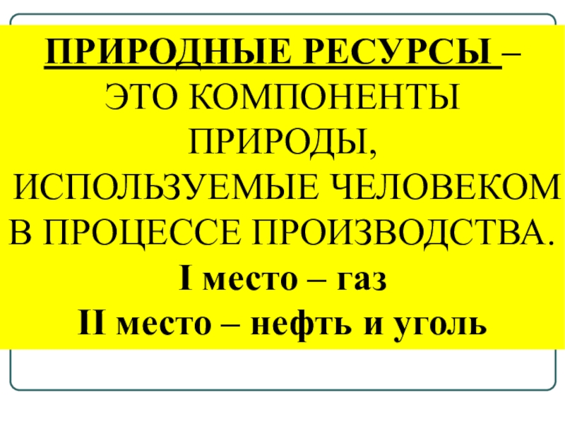 Слайд 8ПРИРОДНЫЕ РЕСУРСЫ – ЭТО КОМПОНЕНТЫ ПРИРОДЫ, ИСПОЛЬЗУЕМЫЕ ЧЕЛОВЕКОМ В ПРОЦЕССЕ ПРОИЗВОДСТВА. I место – газ