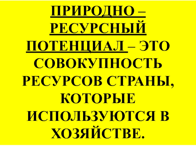 Слайд 7ПРИРОДНО – РЕСУРСНЫЙ ПОТЕНЦИАЛ – ЭТО СОВОКУПНОСТЬ РЕСУРСОВ СТРАНЫ, КОТОРЫЕ ИСПОЛЬЗУЮТСЯ В ХОЗЯЙСТВЕ.