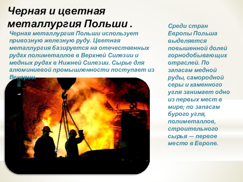 Черная металлургия Польши использует привозную железную руду. Цветная металлургия базируется на отечественных рудах полиметаллов в Верхней Силезии и медных рудах в Нижней Силезии. Сырье для алюминиевой промышленности поступает из Венгрии.