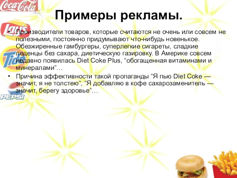 постоянно придумывают что-нибудь новенькое. Обезжиренные гамбургеры, суперлегкие сигареты, сладкие леденцы без сахара, диетическую газировку. В Америке совсем недавно появилась Diet Coke Plus, “обогащенная витаминами и минералами”…