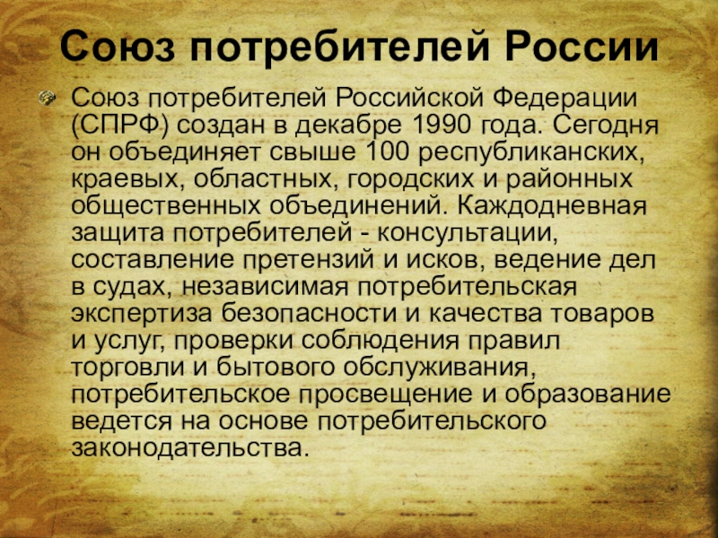 1990 года. Сегодня он объединяет свыше 100 республиканских, краевых, областных, городских и районных общественных объединений. Каждодневная защита потребителей - консультации, составление претензий и исков, ведение дел в судах, независимая потребительская экспертиза безопасности и качества товаров и услуг, проверки соблюдения правил торговли и бытового обслуживания, потребительское просвещение и образование ведется на основе потребительского законодательства.