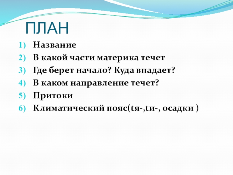 ПЛАННазваниеВ какой части материка течетГде берет начало? Куда впадает?В каком направление течет?ПритокиКлиматический пояс(tя-,tи-, осадки )