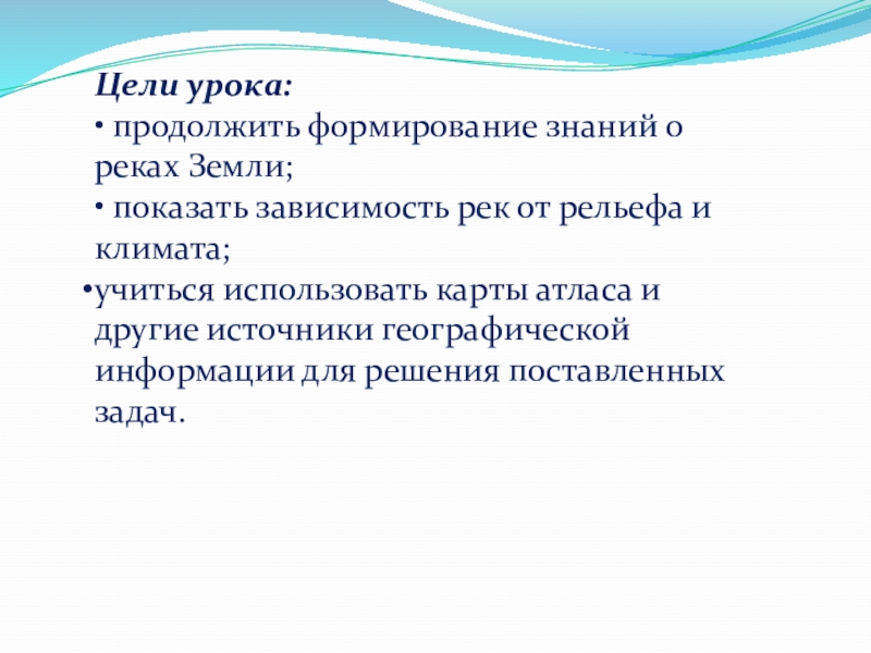 Цели урока:• продолжить формирование знаний о реках Земли;• показать зависимость рек от рельефа и климата;учиться использовать карты атласа и другие источники географической информации для решения поставленных задач.