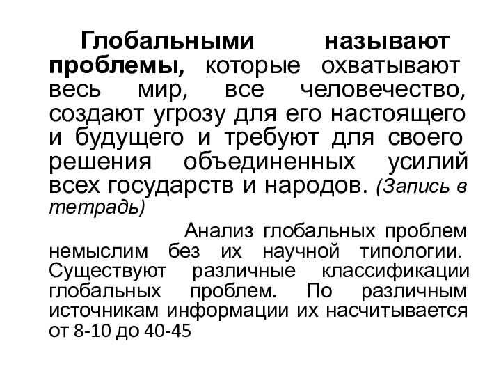 Слайд 9 Глобальными называют проблемы, которые охватывают весь мир, все человечество, создают угрозу
