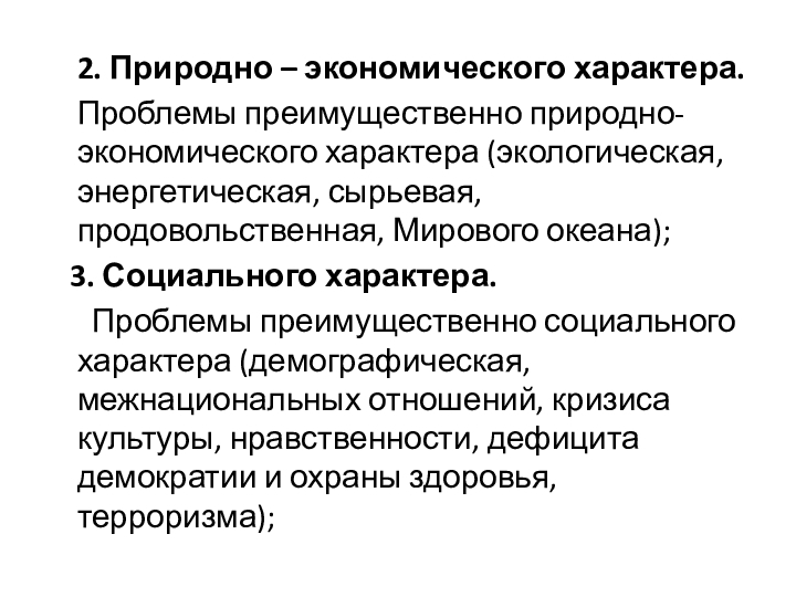 характера (экологическая, энергетическая, сырьевая, продовольственная, Мирового океана);