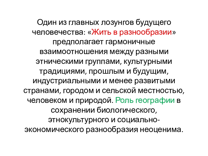 взаимоотношения между разными этническими группами, культурными традициями, прошлым и будущим, индустриальными и менее развитыми странами, городом и сельской местностью, человеком и природой. Роль географии в сохранении биологического, этнокультурного и социально-экономического разнообразия неоценима.