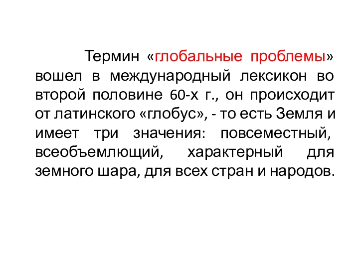 «глобальные проблемы» вошел в международный лексикон во второй половине 60-х г., он происходит от латинского «глобус», - то есть Земля и имеет три значения: повсеместный, всеобъемлющий, характерный для земного шара, для всех стран и народов.