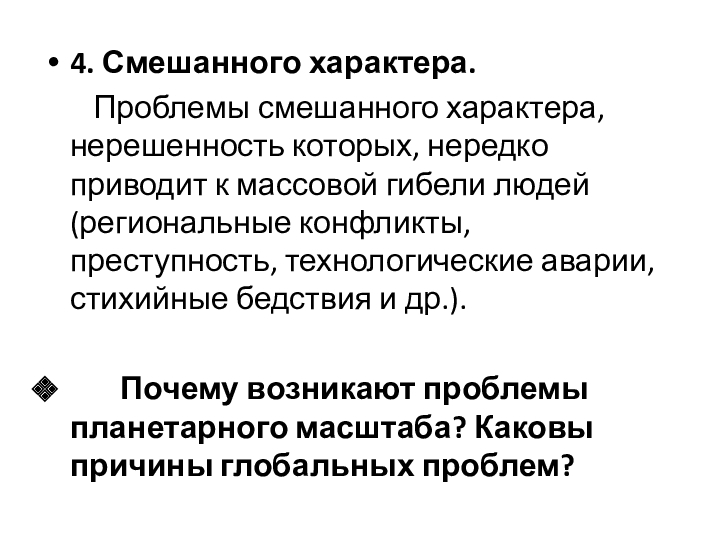 Проблемы преимущественно социального характера (демографическая, межнациональных отношений, кризиса культуры, нравственности, дефицита демократии и охраны здоровья, терроризма);