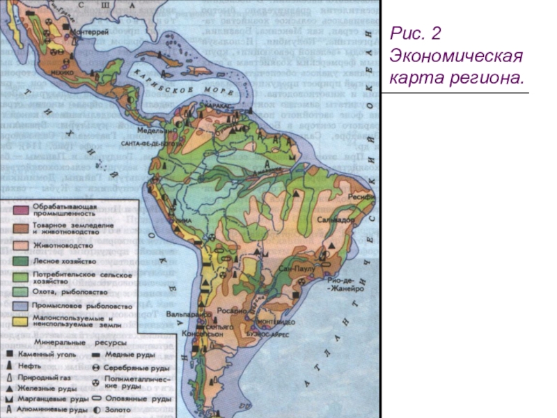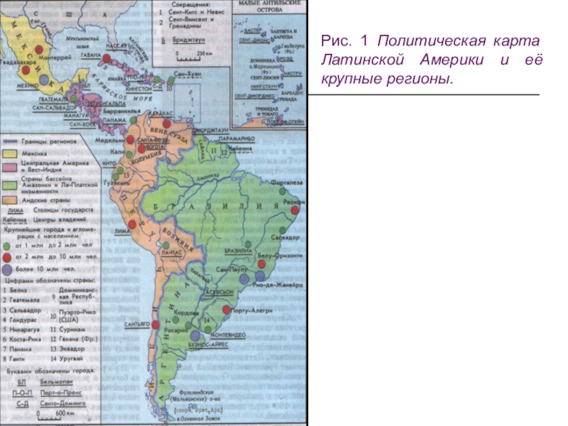 Слайд 3Рис. 1 Политическая карта Латинской Америки и её крупные регионы.