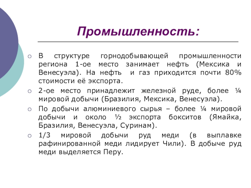 В структуре горнодобывающей промышленности региона 1-ое место занимает нефть (Мексика и