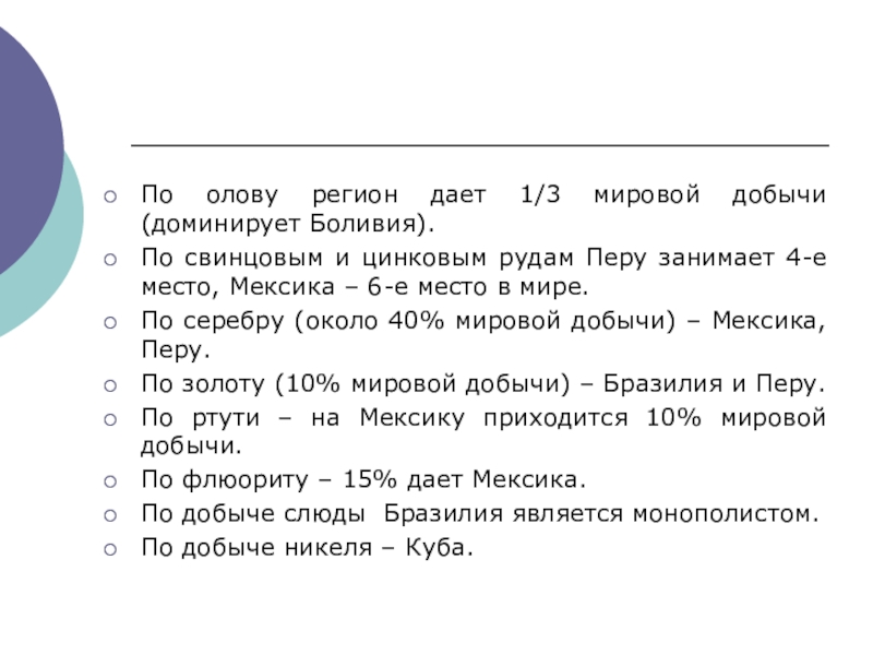 По олову регион дает 1/3 мировой добычи (доминирует Боливия).