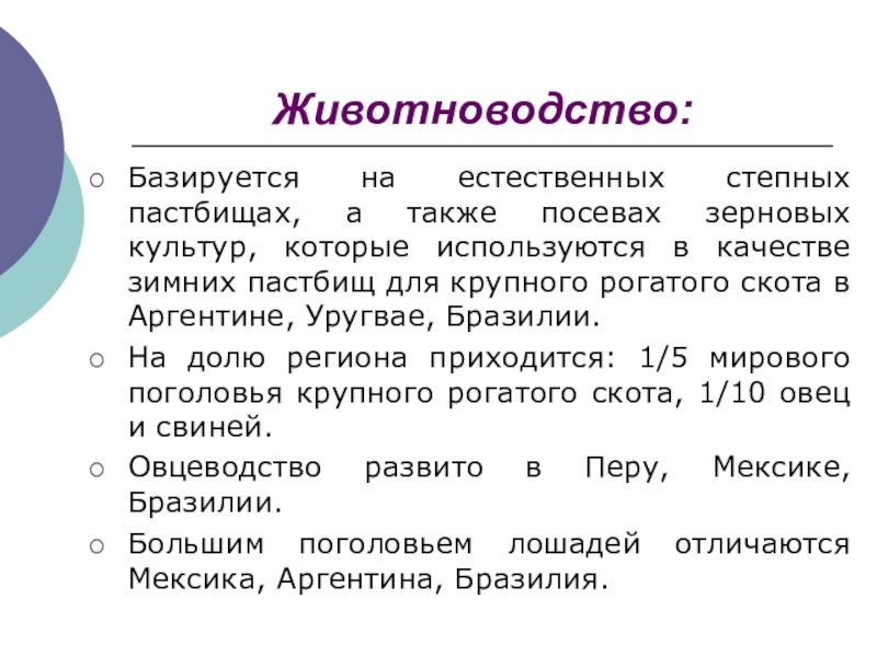На долю региона приходится: 1/5 мирового поголовья крупного рогатого скота, 1/10 овец и свиней.