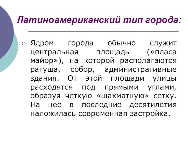 Ядром города обычно служит центральная площадь («пласа майор»), на