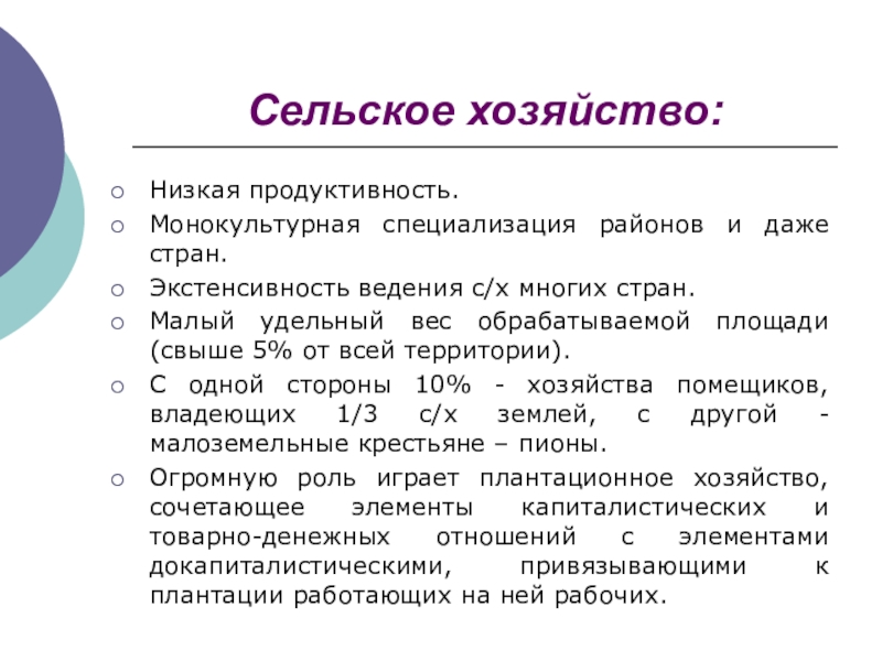 Огромную роль играет плантационное хозяйство, сочетающее элементы капиталистических и товарно-денежных отношений с элементами докапиталистическими, привязывающими к плантации работающих на ней рабочих.