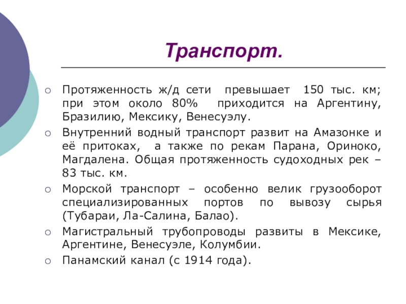 Внутренний водный транспорт развит на Амазонке и её притоках, а также по рекам Парана, Ориноко, Магдалена. Общая протяженность судоходных рек – 83 тыс. км.