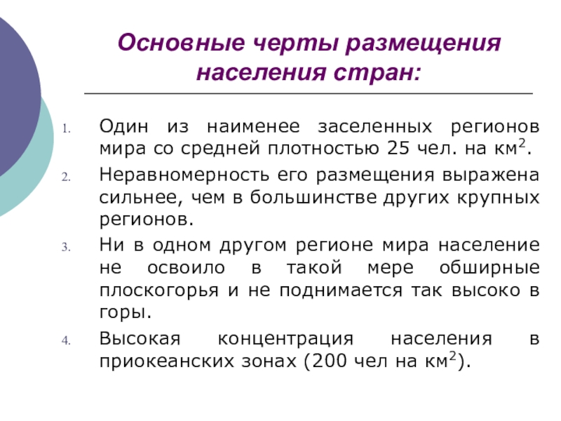 Высокая концентрация населения в приокеанских зонах (200 чел на км2).