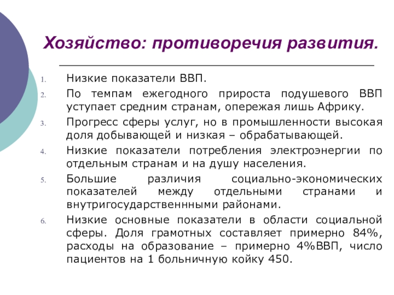 Низкие основные показатели в области социальной сферы. Доля грамотных составляет примерно 84%, расходы на образование – примерно 4%ВВП, число пациентов на 1 больничную койку 450.