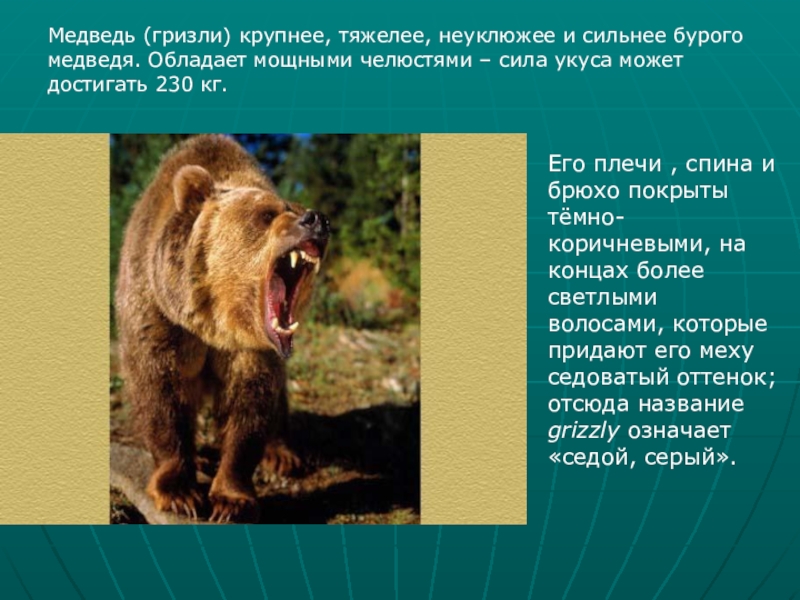 Его плечи , спина и брюхо покрыты тёмно-коричневыми, на концах более светлыми волосами, которые придают его меху седоватый оттенок; отсюда название grizzly означает «седой, серый».