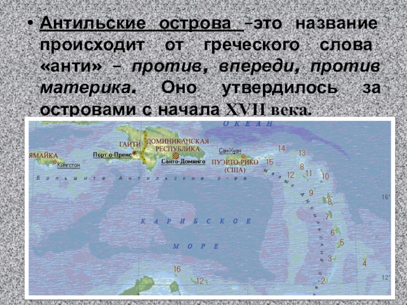 Антильские острова –это название происходит от греческого слова «анти» – против, впереди, против материка. Оно утвердилось за