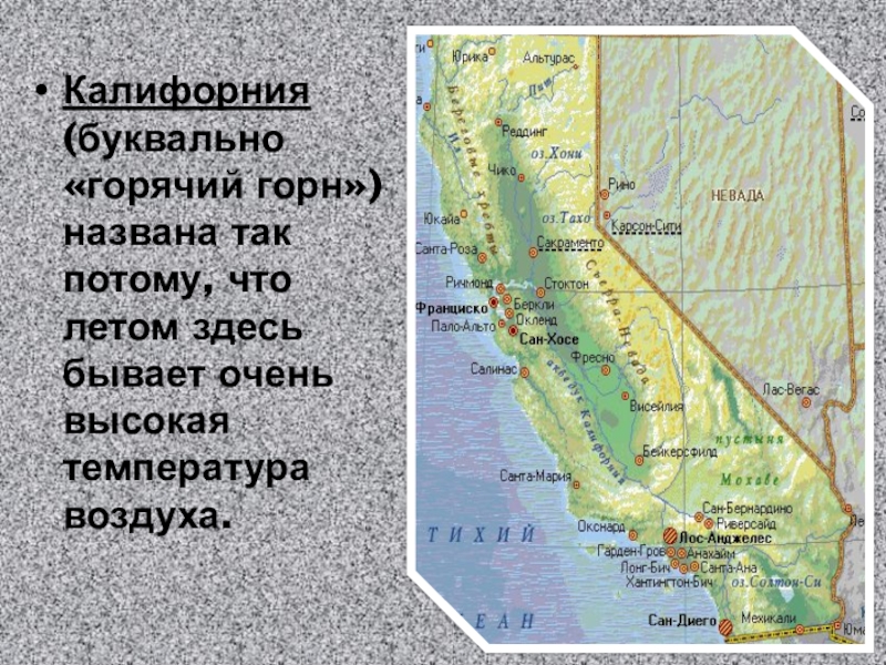 Слайд 14Калифорния (буквально «горячий горн») названа так потому, что летом здесь бывает