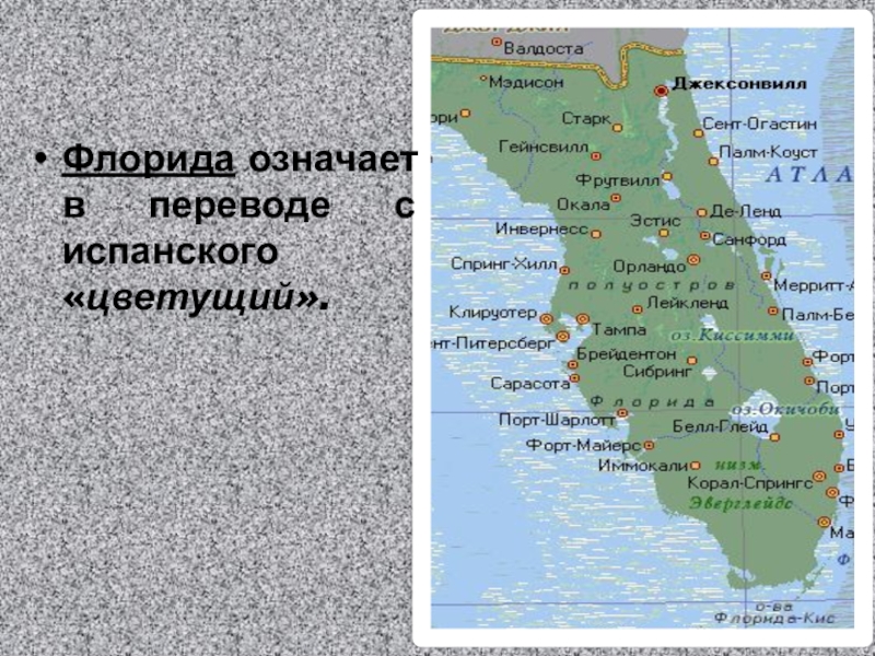 Слайд 8Флорида означает в переводе с испанского «цветущий».