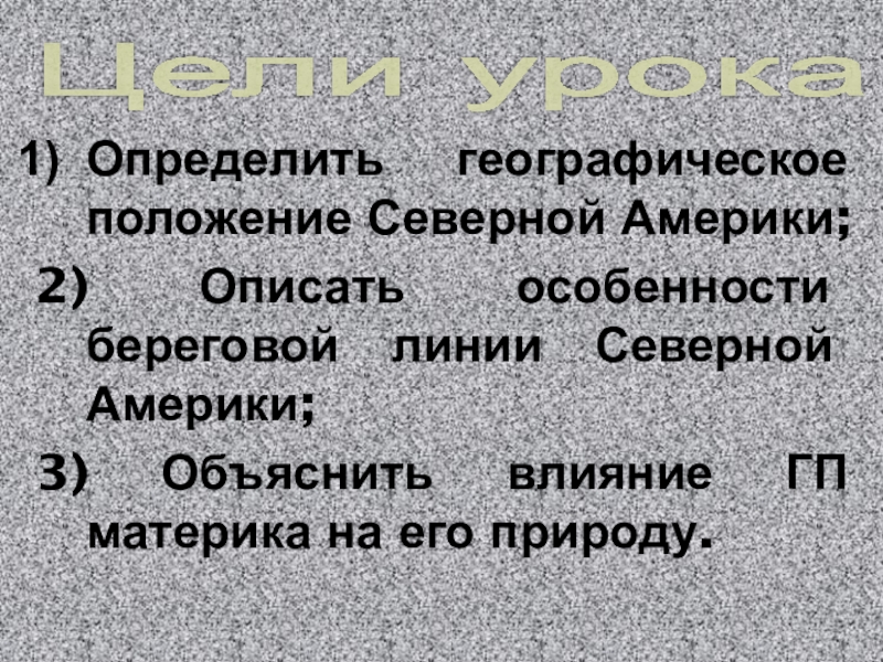 Цели урока:Определить географическое положение Северной Америки;2) Описать особенности береговой линии Северной Америки;3) Объяснить влияние ГП материка на его природу.