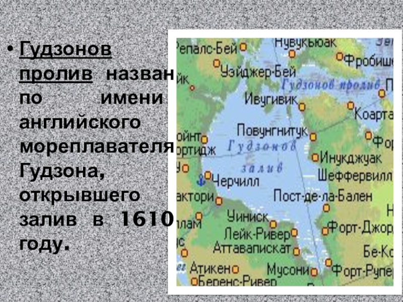 Гудзонов пролив назван по имени английского мореплавателя Гудзона, открывшего залив в 1610 году.