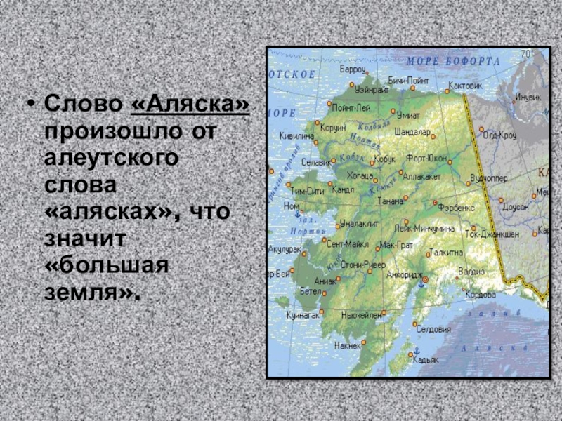Слайд 13Слово «Аляска» произошло от алеутского слова «алясках», что значит «большая земля».