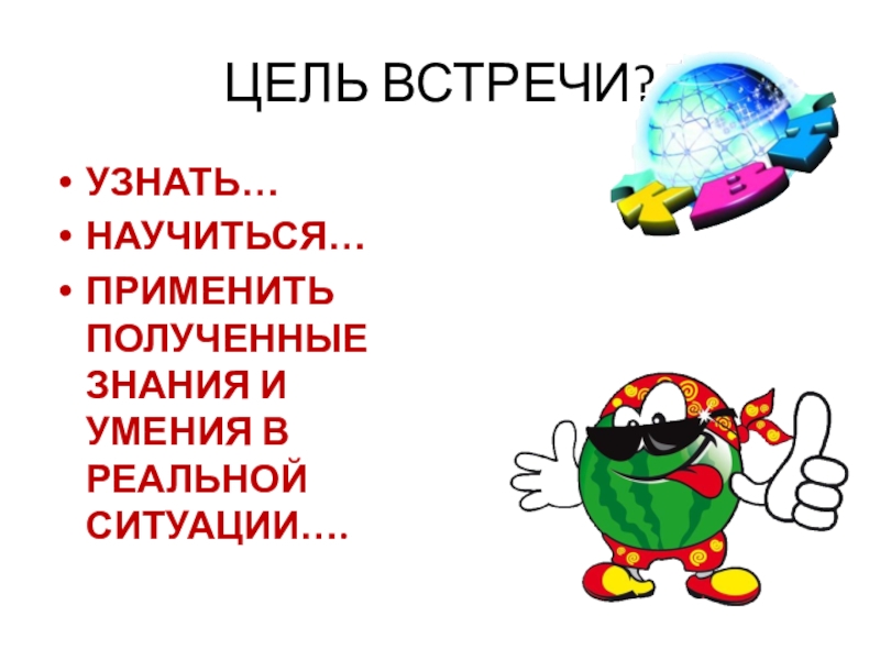 ЦЕЛЬ ВСТРЕЧИ?УЗНАТЬ…НАУЧИТЬСЯ…ПРИМЕНИТЬ ПОЛУЧЕННЫЕ ЗНАНИЯ И УМЕНИЯ В РЕАЛЬНОЙ СИТУАЦИИ….