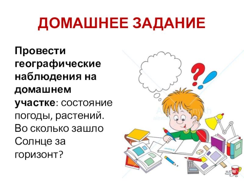 ДОМАШНЕЕ ЗАДАНИЕПровести географические наблюдения на домашнем участке: состояние погоды, растений. Во сколько зашло Солнце за горизонт?