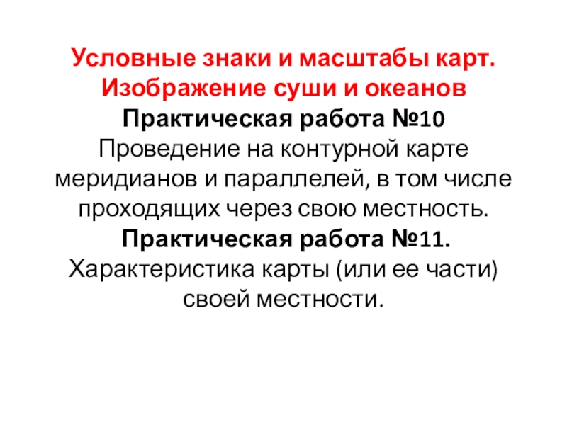 Условные знаки и масштабы карт. Изображение суши и океанов Практическая работа №10 Проведение на контурной карте меридианов и параллелей, в том числе проходящих через свою местность. Практическая работа №11. Характеристика карты (или ее части) своей