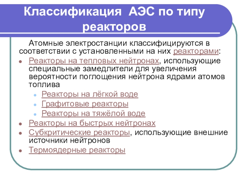 Слайд 4Классификация АЭС по типу реакторов