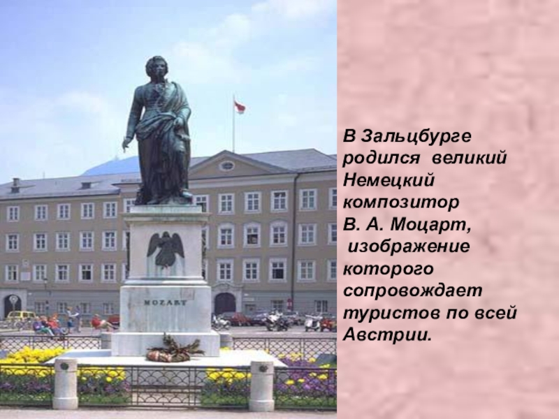 В Зальцбурге родился великий Немецкий композитор В. А. Моцарт, изображение которого сопровождает туристов по всей Австрии.