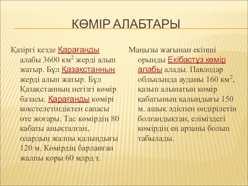 Маңызы жағынан екінші орынды Екібастұз көмір алабы алады. Павлодар облысында ауданы 160 км2, қазып алынатын көмір қабатының қалыңдығы 150 м. ашық әдіспен өндірілетін болғандықтан, еліміздегі көмірдің ең арзаны болып табылады.