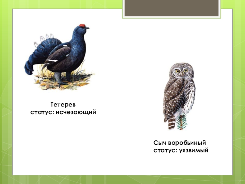 Сыч воробьиныйстатус: уязвимыйТетеревстатус: исчезающий