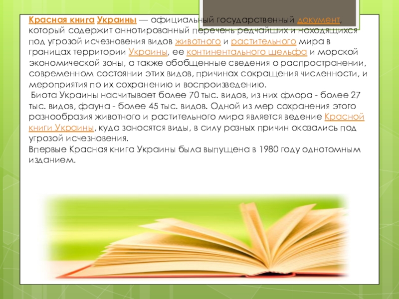 Слайд 2Красная книга Украины — официальный государственный документ, который содержит аннотированный перечень редчайших