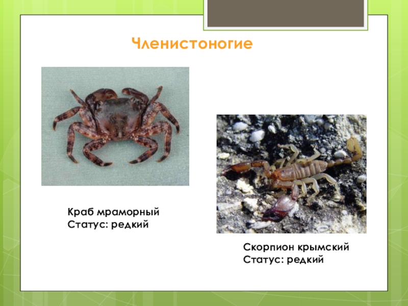 Краб мраморныйСтатус: редкийСкорпион крымскийСтатус: редкийЧленистоногие