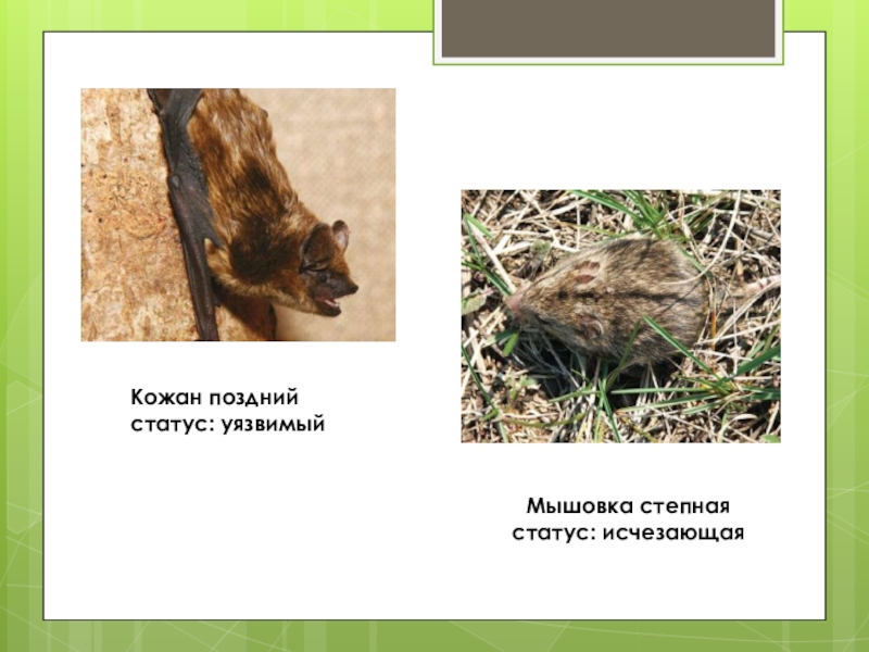 Кожан позднийстатус: уязвимыйМышовка степнаястатус: исчезающая