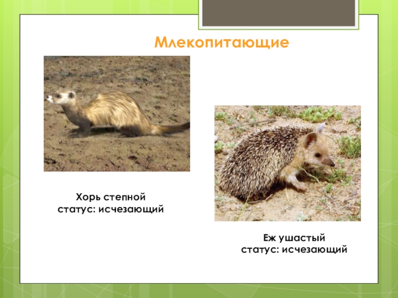 Хорь степнойстатус: исчезающий Млекопитающие Еж ушастыйстатус: исчезающий