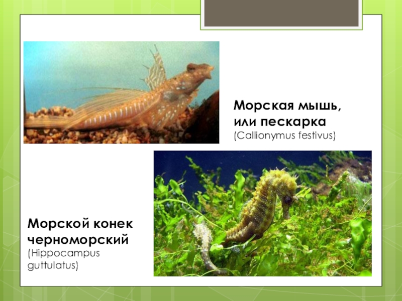 Морская мышь, или пескарка (Callionymus festivus)Морской конек черноморский (Hippocampus guttulatus)