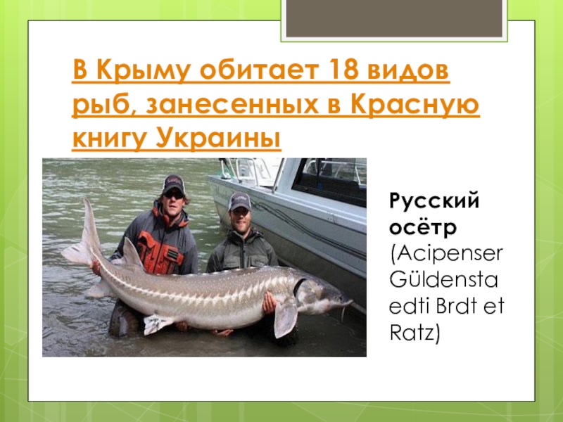 В Крыму обитает 18 видов рыб, занесенных в Красную книгу УкраиныРyccкий осётр (Acipenser Güldenstaedti Brdt et Ratz)