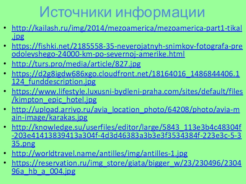 Источники информацииhttp://kailash.ru/img/2014/mezoamerica/mezoamerica-part1-tikal.jpghttps://fishki.net/2185558-35-neverojatnyh-snimkov-fotografa-preodolevshego-24000-km-po-severnoj-amerike.htmlhttp://turs.pro/media/article/827.jpghttps://d2g8igdw686xgo.cloudfront.net/18164016_1486844406.1124_funddescription.jpghttps://www.lifestyle.luxusni-bydleni-praha.com/sites/default/files/kimpton_epic_hotel.jpghttp://upload.arrivo.ru/avia_location_photo/64208/photo/avia-main-image/karakas.jpghttp://knowledge.su/userfiles/editor/large/5843_113e3b4c48304f-203e41413839413a304f-4d3d46383a3b3e3f3534384f-223e3c-5-335.pnghttp://worldtravel.name/antilles/img/antilles-1.jpghttps://reservation.ru/img_store/giata/bigger_w/23/230496/230496a_hb_a_004.jpg
