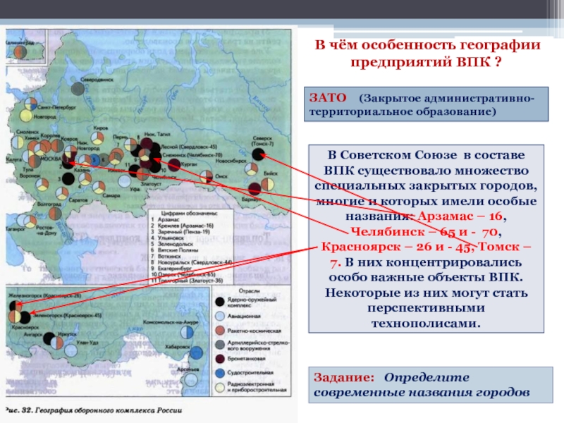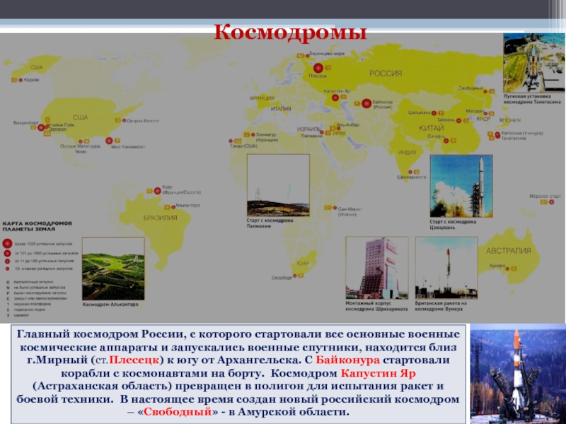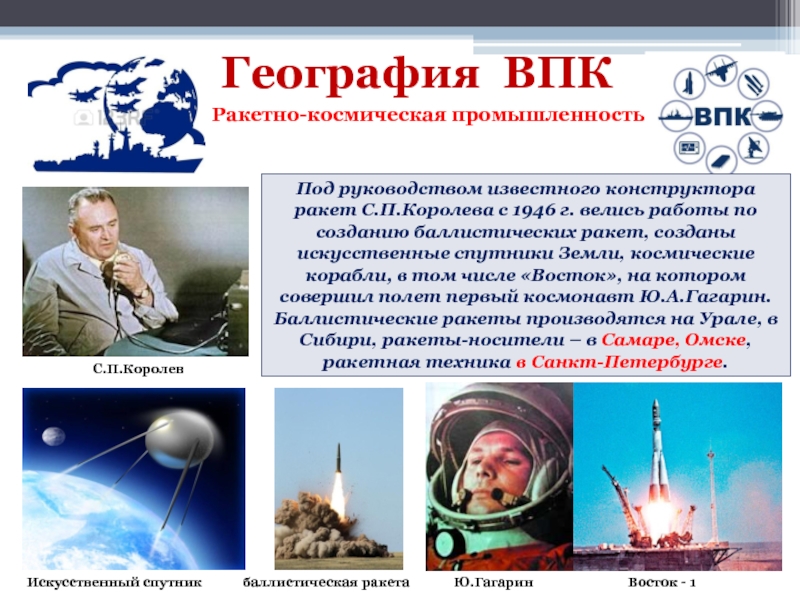 Под руководством известного конструктора ракет С.П.Королева с 1946 г. велись работы по созданию баллистических ракет, созданы искусственные спутники Земли, космические корабли, в том числе «Восток», на котором совершил полет первый космонавт Ю.А.Гагарин. Баллистические ракеты производятся на Урале, в Сибири, ракеты-носители – в Самаре, Омске, ракетная техника в Санкт-Петербурге.