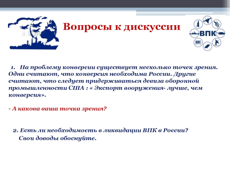 Одни считают, что конверсия необходима России. Другие считают, что следует придерживаться девиза оборонной промышленности США : « Экспорт вооружения- лучше, чем конверсия».