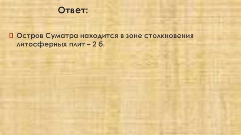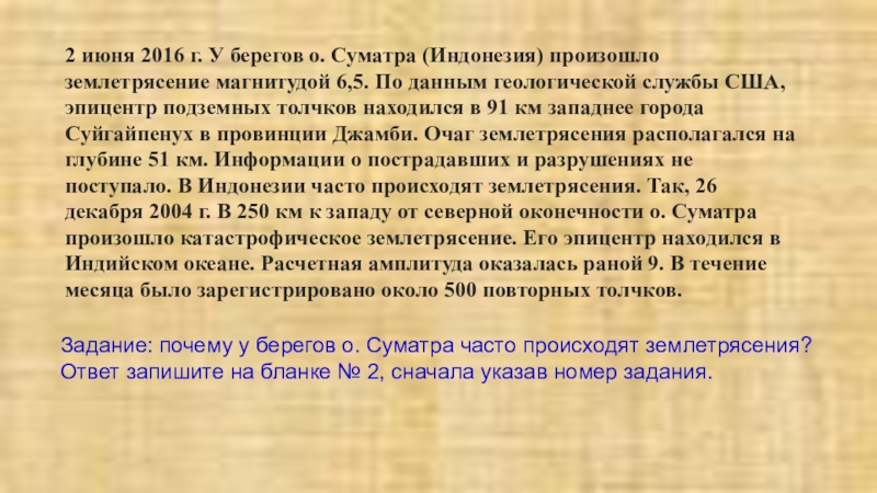 Задание: почему у берегов о. Суматра часто происходят землетрясения? Ответ запишите на бланке № 2, сначала указав номер задания.