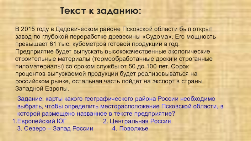 Задание: карты какого географического района России необходимо выбрать, чтобы определить месторасположение Псковской области, в которой размещено названное в тексте предприятие?