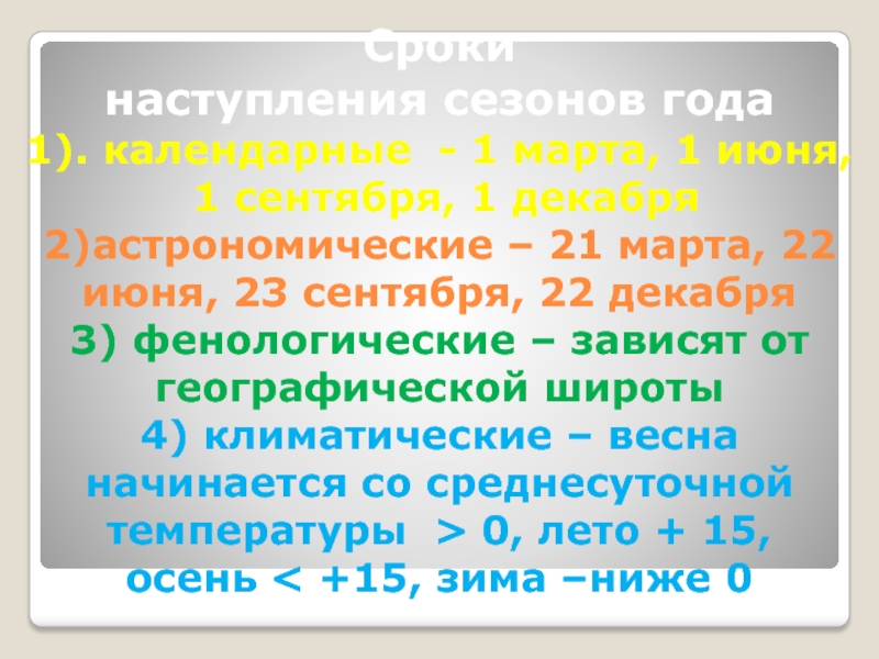 4) климатические – весна начинается со среднесуточной температуры > 0, лето + 15,